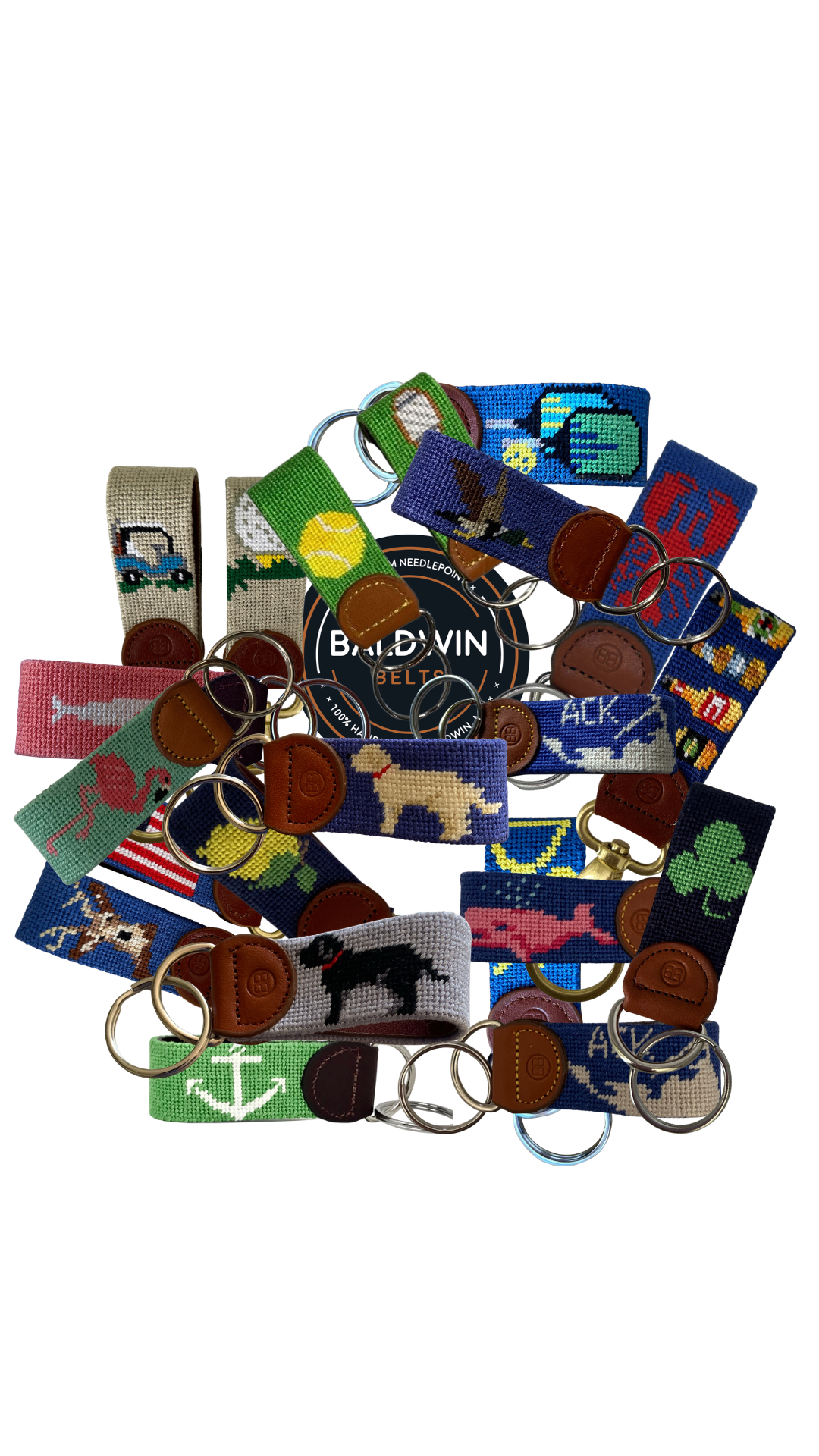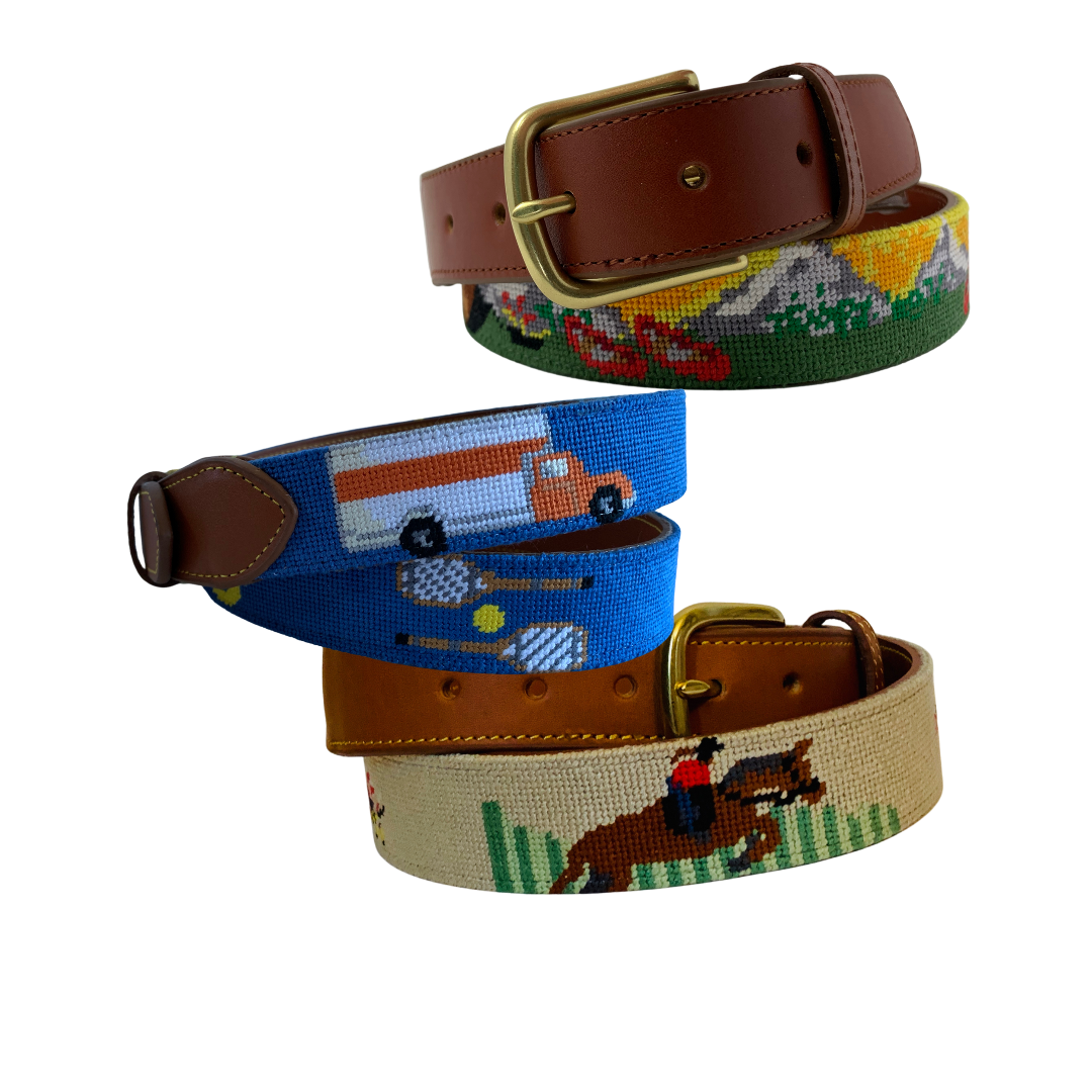 Our artisans hand-stitch your belt on 18-count canvas, one careful stitch at a time. It's then backed with full-grain leather and finished with a solid brass buckle. Good things take time — please allow 10 to 12 weeks from approval to delivery. We'll keep you updated along the way.