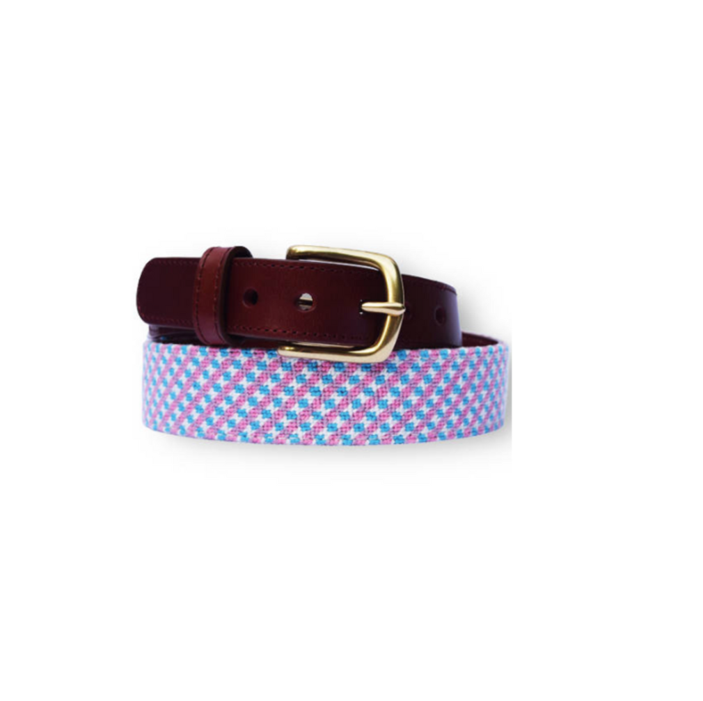 Our women's pink and blue herringbone needlepoint belt is the perfect accessory to add a playful yet sophisticated touch to any outfit. Whether paired with chinos for a day at work or worn with jeans and a blouse for a casual brunch with friends, it is sure to make a statement in your wardrobe.