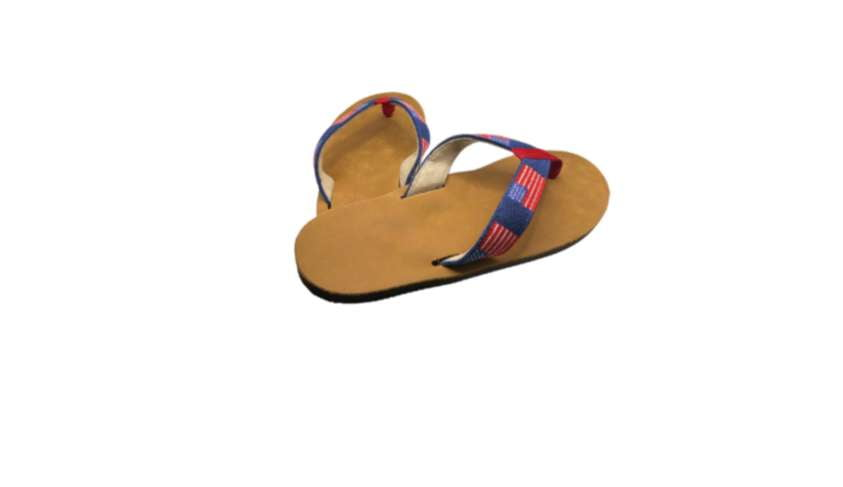 Needlepoint American flag flip-flops are a stylish and patriotic footwear option for that casual summer wear. These flip-flops feature straps adorned with hand-stitched designs of the American flag, showcasing red and white stripes alongside a blue field with white stars.