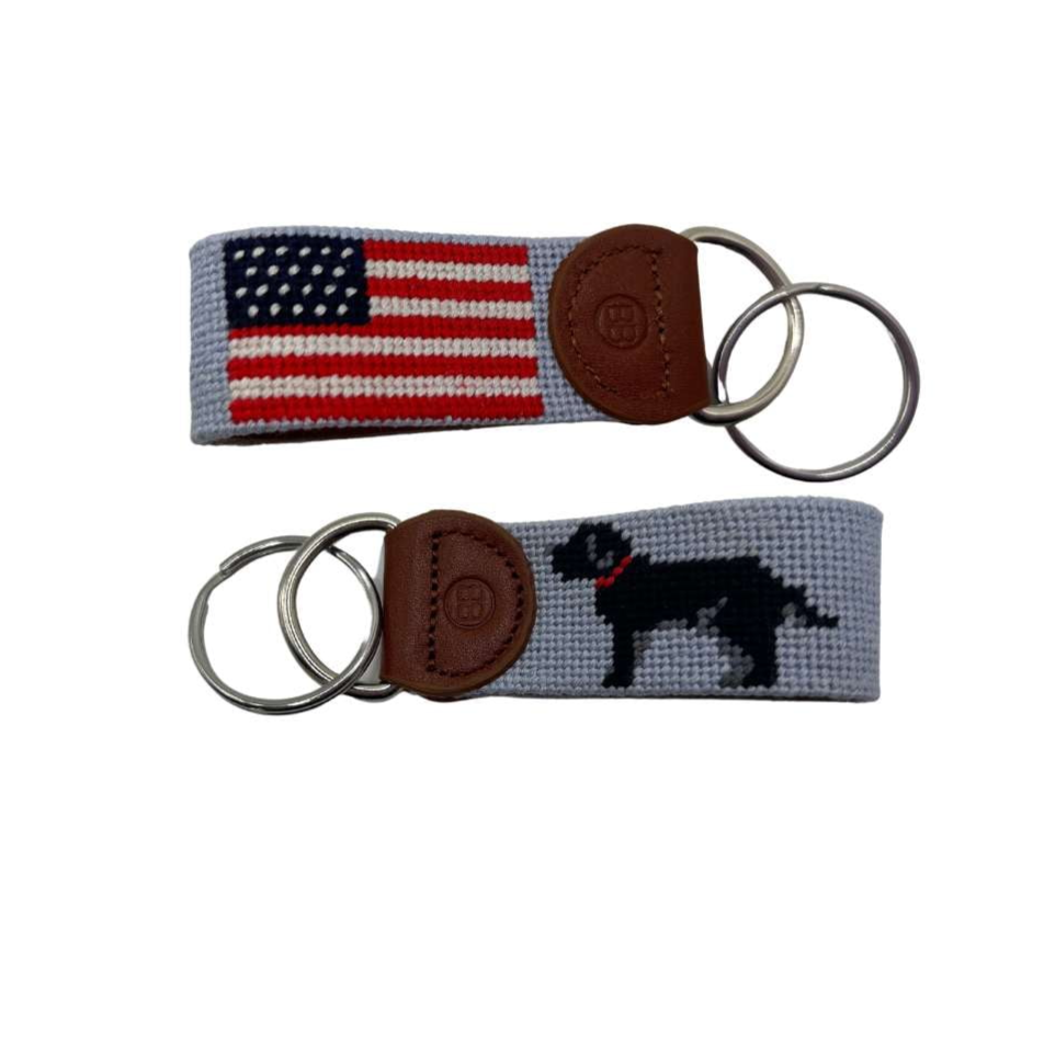 Our classic black lab key fob features the American Flag on the opposite side of the fob. Hand-stitched and leather backed for everyday use.