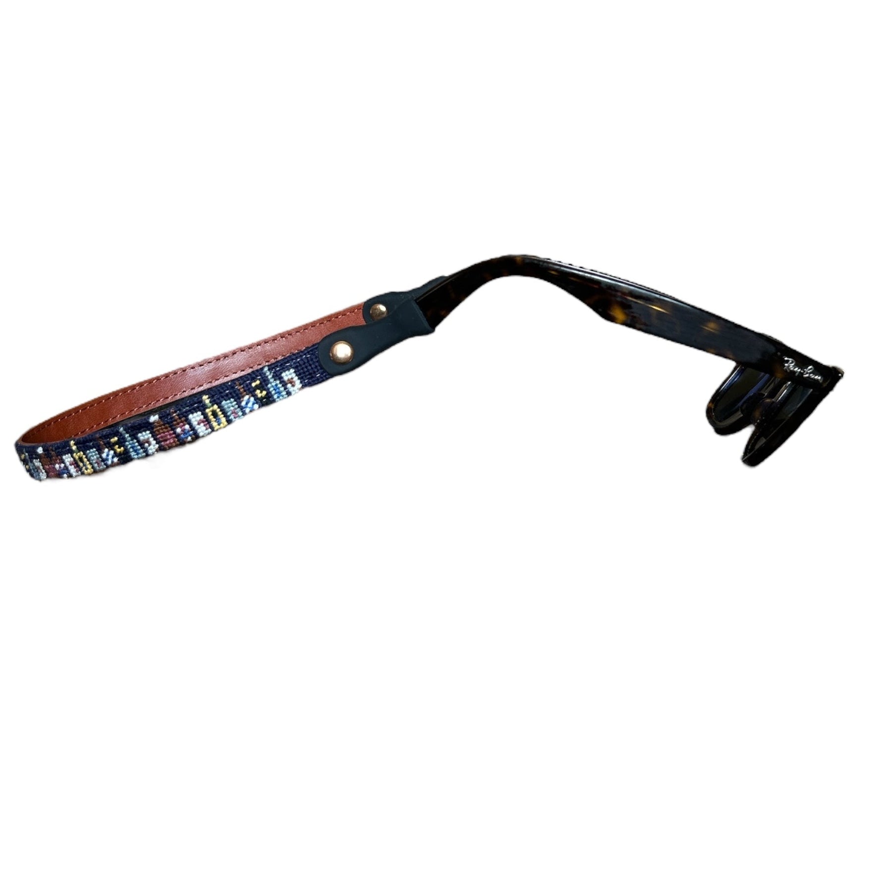 Our needlepoint sunglass straps are a practical accessory to keep your sunglasses safe and secure while adding a touch of personality to your look.  Our straps are hand stitched with cotton threads and leather backed, total length 18.5"