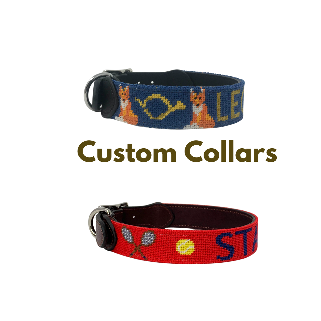 Custom Needlepoint dog collar. We work with your ideas and images to create a truly unique collar for your pup. Free unlimited mockups. Always free shipping.