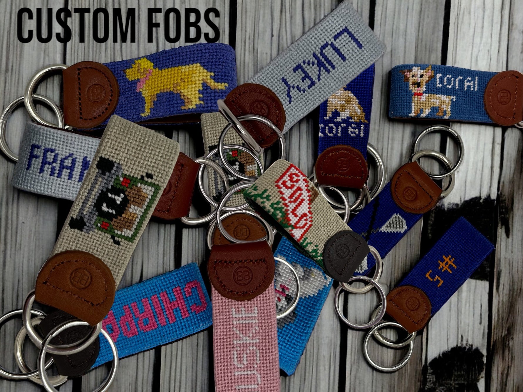 Made to Order- Custom Needlepoint Key Fob, 7-8 week stitch time, 5 leather options, free unlimited mockups.  Great for  corporate, golf, tennis , school events.  Bulk discounts given.