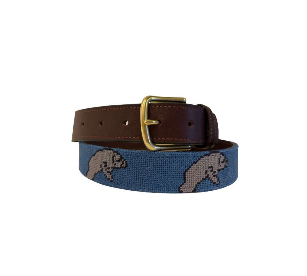 Embrace the serene beauty of the sea with our Manatee Needlepoint Belt,  that captures the gentle grace of these beloved marine mammals. Hand stitched with meticulous attention to detail, each stitch brings to life the endearing charm of the manatee, creating a wearable work of art that is both stylish and whimsical.